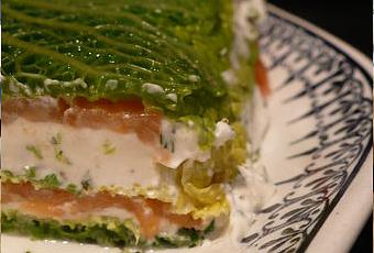 - Déposer 2 feuilles de chou au fond puis recouvrir de saumon fumé. Verser la moitié de la préparation au fromage. Recommencer l'opération puis terminer par des feuilles de chou