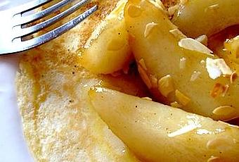 Garnissez les crêpes chaudes du mélange de poires caramélisées. Parsemez d'amandes grillées et servez immédiatement.