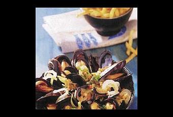 - Mélanger dans une marmite les moules avec l'oignon, les échalotes, le céleri, le thym et du poivre. Mouiller avec le vin. Couvrir et cuire 5 mn à feu vif en secouant la marmite à plusieurs reprises.