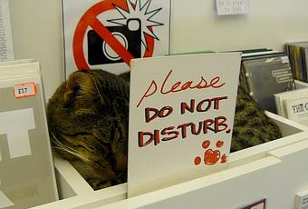 C'est une drôle décoration que ce chat qui est confortablement installé entre des cartes et des disques et qu'il ne faut pas déranger, ni flasher!