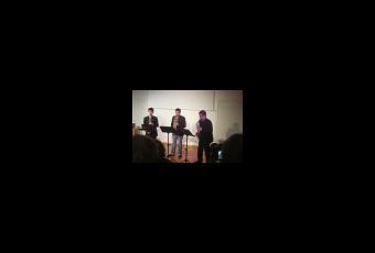 33 professeurs prodiguent 300 heures de cours chaque année à l'école de musique de Lomme. Ces enseignants sont payés par les mairies et pour progresser dans leur carrière professionnelle, doivent passer des concours de la Fonction publique territoriale. Il leur est demandé notamment d'interpréter, devant un jury, des pièces musicales d'une certaine technicité et d'une plus grande complexité que celles données habituellement en public. Cette nouvelle carte blanche offerte par la médiathèque l'Odyssée était donc pour eux l'occasion d'une répétition grandeur nature, devant un jury composé de leurs élèves, de leurs admirateurs et d'amateurs de musique.Nos musiciens d'un soir étaient donc nos deux saxophonistes Jérôme et Simon, accompagnés par Samuel au piano. Le répertoire qu'ils nous proposèrent sortait donc davantage des sentiers battus, composé de pièces plus compliquées et plus fouillées, mais tout compte fait agréables à écouter. Si j'osais un commentaire je dirais que si ordinairement, par exemple, les compositeurs de musique au cinéma visionnent les images et écrivent la partition simultanément, ici c'était plutôt le contraire : leur musique qui parle de la vie faisait naître des images et des sentiments.