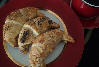 eux-mêmes,en finissant par la pointe, les poser sur une plaque sulfurisé allant au four, les badigeonner à l'oeuf puis parsemer la surface