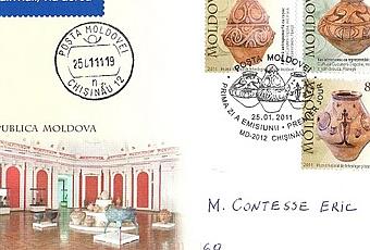 L'illustration de cette enveloppe montre la salle du musée national d'archéologie et d'histoire de Chişinău où sont exposées ces 3 céramiques : amphore anthropomorphe avec son couvercle découverte à Rădulenii Vechi, situé dans le raion de Floreşti (0,85 L), vase bitronconique avec des motifs zoomorphes découvert à Vărvăreuca, raion de Floreşti (1,20 L) et vase bitronconique avec des motifs anthropomorphes découvert à Sofia, dans le raion de Drochia (8,50 L).
