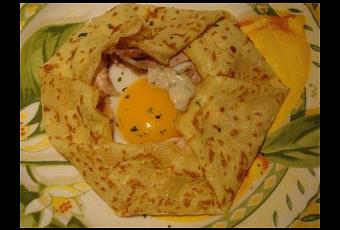Présentation : Mettre votre crêpe dans l’assiette, puis mettre une cuillère à soupe de béchamel, disposer quelques morceaux de poulet rôti sans peau, puis l’oeuf par dessus.
