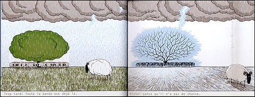 Les livres pour enfants me fascinent. Alors quand une bouille souriante de 3 ans vous demande de lire une histoire de Sylvain Victor avec un titre aussi amusant, comment résister ?Michel est donc un mouton, qui vit dans un enclos avec d’autres moutons. Mais contrairement à ce à quoi on pourrait s’attendre pour une bête de son espèce, Michel a toujours plein de problèmes. Tenez, par exemple, il adore les framboises. Mais il ne peut pas manger celles qui sont sur le rebord de la falaise, juste de l’autre côté de l’enclos : la clôture est électrifiée… Michel se retourne, pensant qu’il n’a pas de chance, pendant que le petit bout de falaise s’écroule de lui-même…Plus tard, pendant l’orage, Michel veut s’abriter sous l’arbre. Mais tous les autres moutons ont déjà pris toute la place ! En repartant sous la pluie, il pense qu’il n’a vraiment pas de chance. Ce qu’il ne voit pas, c’est l’éclair qui frappe alors l’arbre, et tous les moutons avec !Ca continue comme ça pendant une quarantaine de pages. C’est drôle, pas glauque du tout malgré les exemples que j’ai cité, et c’est bien dessiné (le loup qui se bouche le nez a bien fait rire tout le monde). Comble des combles, la morale est simple, et plaira beaucoup aux irréductibles optimistes comme moi. Un petit livre sympa, qu’on aimerait bien relire une fois terminé :)