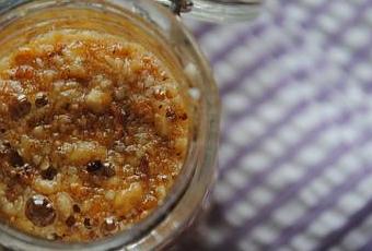 To a jar of honey, add some almond powder (approx. 1/2 cup) and some praline (1/2 cup).