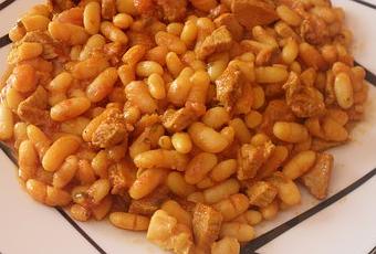 250 g d'haricots blancs100 g de viande tendre coupée en dés1 oignon émincé2 tomates pelées et coupées en dés1 cuillère à soupe de coriandre hachée2 gousses d'ail rapée1 cuillère à café de sel, poivre, cumin, paprikassafran 2 cuillère à soupe d'huile d'olive10 cl de coulis de tomate Tremper la veille les haricots blancs secs dans l'eau.