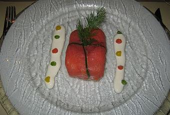INGREDIENTS:Pour 6 personnes:-6 grandes tranches de saumon fumé-300 gr de filet de saumon frais-1 carotte-1/2 concombre-1/2 bon morceau de céleri rave-jus de citron-Huile d' olive-Crème fraîche-Ciboulette-sel, poivrePREPARATION:*Dans la carotte et le concombre , lever à la cuillère à parisienne (le plus petite possible) des billes de légumes et mettre blanchir 5 minutes. Rafraîchir.*Râper le céleri rave finement et citronner.*Hacher à la grille large le filet de saumon et l'assaisonner de sel et de poivre *Le citronner comme pour un tartare.*Mélanger le saumon avec le céleri et lier le tout avec un peu de crème légèrement battue.*Rectifier l'assaisonnement et ajouter de la ciboulette finement hachée.*Couper les tranches de saumon fumé en deux et les étaler sur le plan de travail.*Répartir la farce sur ces demi tranches et replier de telle sorte à former de petits paquets réguliers.*Maintenir avec des brins de ciboulette blanchis quelques secondes.*Dresser ces pannequets au centre de l'assiette.*Saucer autour avec une préparation obtenue en mélangeant de la crème avec le jus de citron, sel et poivre.*Parsemer de biles de légumes et de brins de ciboulette conservés un peu plus long.Bon appétit et bonne semaine à tous!