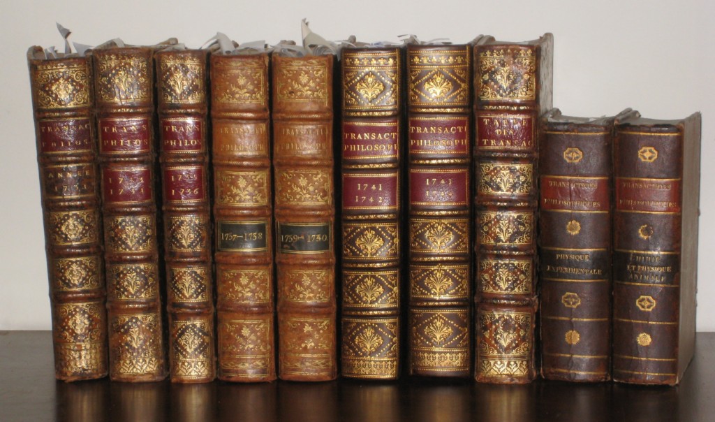 Transactions philosophiques de la Société Royale de LondresParis, Piget, puis Le Breton, David l’Aîné, Le Breton et Durand. 1741, 1741, 1740, 1740, 1738, 1738, 1757, 1759, 1757, 1757, 1760, 1758, 1760. Année 1731 : frontispice, X, 304 pp - Année 1732 : VIII, 323 pp,16 pl.Année 1733 : frontispice, VIII, 280 pp - Année 1734 : VII, 340, 16 pp, 1 carte aquarellée, 11 pl.Année 1735 : frontispice, (6) pp, pp III à VI, 192 pp - Année 1736 : (2), VIII, 302, 15 pp, 13 pl.Années 1737 et 1738 : LX, 539 pp, 12 pl.Année 1739 : (4), VIII, 214, (1) pp, 5 pl - Année 1740 : VIII, 279 pp, 8 pl.Année 1741 : XII, 359, (1) pp, 12 pl - Année 1742 : (7) pp, pp IV à XII, 310, (1) pp, 9 pl.Année 1743 : (4) pp, pp V à XII, 377, (1) pp, 18 pl - Année 1744 : (4), X, 343, (1) pp, 8 pl.
