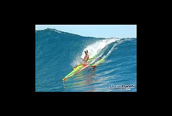 sur des embarcations polynésiennes d'environ 150 kilos, avec balancier de 6 places (dites V6),