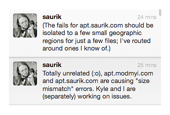 Je ne sais pas si vous l’aviez remarqué mais depuis la sortie de Greenp0ison, les serveurs de Modmyi et de BigBoss ont eu du mal à suivre :/ Hier, c’était au cours de Saurik de subir quelques bugs Cependant, tout semble être rentré dans l’ordre à l’heure actuelle Seuls les serveurs de myrepospace.com semble problématique (chose quasi habituelle chez eux). si vous constatez quelconque anomalie, dites-le nous