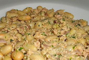 1 boîte de haricots blancs (400g), 1 boîte de miettes de thon, 1 échalote, 1 cs de vinaigre de vin rouge, sel, poivre, 3 cs d'huile d'olive, 1 poignée de persil plat frais haché