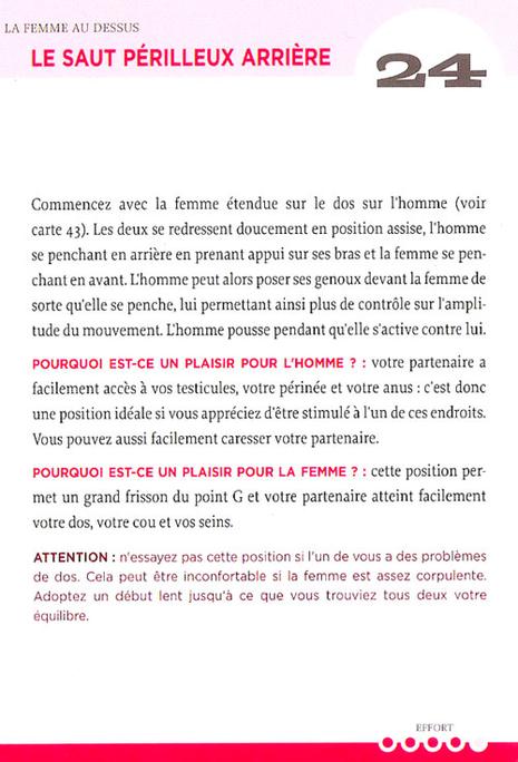 Chaque carte détaille une position différente clairement expliquée dans un français simple. Il y figure des informations pour les deux sexes sur ce que chaque position a à offrir et propose également certaines variantes à essayer le cas échéant.