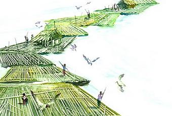 Carte postale d'une peinture montrant le transport du bois sur l'Irrawadi
