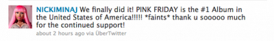 Et oui, elle l'a finalement fait, après E.V.E (et son " Let There Be Eve…Ruff Ryders’ First Lady" ) qui fut la première rappeuse en 1999, au sommet du classement du BillBoard. Nicki Minaj après 11 semaines atteint le fameux sommet. On ne peut que l'a félicité ...