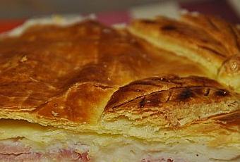 - Etaler la 1ere abaisse de pâte et la recouvrir d'une couche de béchamel puis d'une couche de tranches de jambon. alterner les couches de béchamel et de jambon puis recouvrir de la 2 émé abaisse de pâte feuilletée. Souder les bords en les collant soigneusement. Dorer au jaune d'oeuf légèrement dilué d'eau ou de lait et cuire à 180°C pendant 30 minutes.