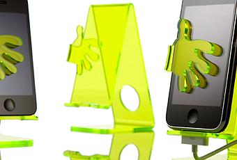 En plexi jaune/vert ou gris le support One Hand servira de dock pour votre iPhone, tout en gardant ''la main'' dessus.
