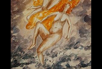 - On nous a dit que ce matin, des crèmes blanches des eaux fortement remuées de l'anse, une dame anadyomène dévêtue, de ces liquides très agités, des écumes de la mer est sortie et, comme dans un drap de bain orangé par une compagne enveloppée, toutes les deux dans le ciel se sont élevées et dans des alto-stratus très étirés, se sont évaporées.