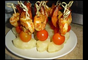 Monter les petites brochettes en mettant 1 gambas, 1 tomate cerise et 1 morceau d’ananas.