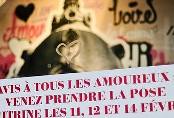 Le BHV, (clic) vous propose d'immortaliser votre amour les 11, 12 et 14 février prochain dans une des vitrines du magasin. Je vous donne l'info avec du retard, car je devais attendre la fin de la "mise en peinture" des vitrines, pour pouvoir prendre un cliché d'un visuel "détourné" à partir d'une de mes photos de la série des "amoureux du pont des Arts", (dernier cliché).