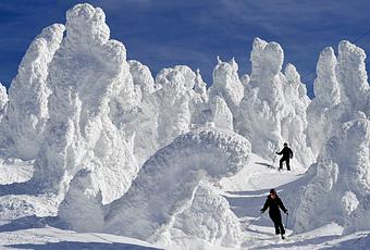 sûrement pas ce couple de skieurs japonais, heureux résidents de la station de Yamagata, dans le nord-est de l’archipel, célèbre pour la splendeur des «monstres de neige» qui font, très