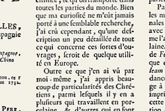 Pour voir la lettre dans son intégralité, vous pouvez consulter les pages 131 à 176 du dixième tome des « Lettres édifiantes et curieuses, écrites des missions étrangères ». Y sont exposés l’Histoire, les techniques de réalisations, la descriptions des manufactures de porcelaine. Le père d’Entrecolles dévoile à la page 141 le secret de la porcelaine que l’Europe cherche à percer depuis des siècles, le kao-lin, qui lui donne blancheur, dureté et translucidité.