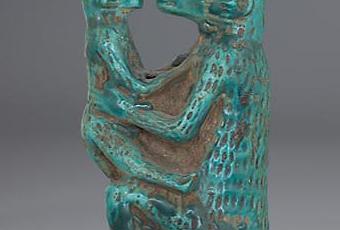 Entre ces deux animaux venus du fond des âges pour manifester devant nous toute la beauté de l'amour maternel - thème récurrent dans l'art égyptien, nous l'avons vu -, une amulette, dont l'anneau est bien visible dans le dos, en faïence siliceuse de 1,5 cm de haut (AF 6953).