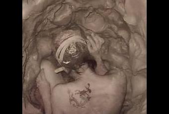 sentiment de panique (ou une certaine ivresse, à la Houdini). Ces chrysalides abandonnées, ces traces minérales d’un corps qui les a façonnées et habitées, mais n’est plus, ces transpositions à l’échelle du corps d’un masque funéraire qui aurait été fait pendant l’agonie, traduisant les ultimes convulsions, sont aussi des formes très sexuelles, pénis en soutane noire dressé vers le ciel, vagin blanc suspendu au plafond comme un soliflore, et le corps du spectateur ne peut que s’y confronter malaisément. Il est symptomatqiue que, dans la galerie biographique des artistes, Juliana soit la seule à ne pas présenter son visage (fort beau, que vous verrez ici, dans la vidéo http://www.dontpaniconline.com/magazine/arts/newspeak-ii-juliana-cerqueira-leite), mais seulement son dos nu tatoué et sa nuque s’enfonçant dans la glaise, artiste au travail au milieu des artistes posants, artiste nue au milieu des artistes vêtus, artiste à la face dissimulée au milieu des visages contents d’eux-mêmes de ses confrères.