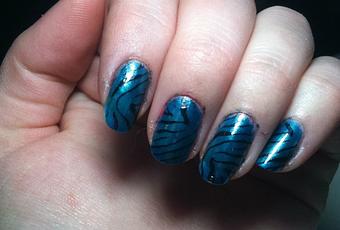 J’ai ajouté dessus avec mon kit Konad les zebrures à l’aide de la plaque M57 et le vernis noir Konad.
