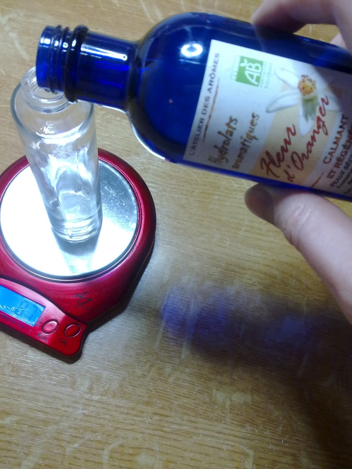 2/ C'est parti. Je verse directement dans mon flacon l'hydrolat de fleur d'oranger... :