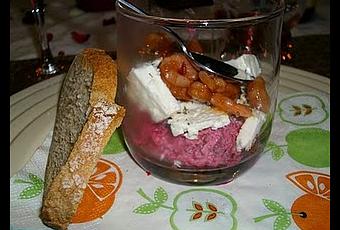 verrine, mousse, betterave rouge, crevettes , marinade, entrée