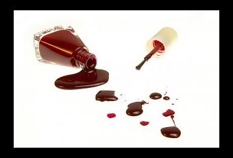 Les vernis à ongles bien alignés les uns à côté des autres, une grosse tâche sur le sol et un pot vide à la main.