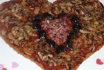 Et voilà ma petite participation au jeu de Domi pour la Saint-Valentin. Je vous ai concocté cette petite pizza (ma première je dois l'avouer) et ma foi elle était parfaite à mon goût. J'y suis allée un peu au hasard en ce qui concerne les ingrédients, je la voulais surtout atout coeur !!!