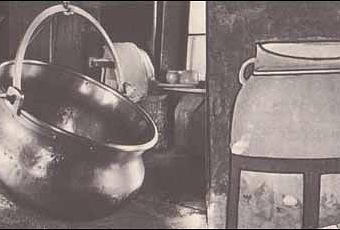 Chaudrons : pendus dans une fromagerie du Jura et sur le feu – Miniature « Régime du corps », de A. de Florence. Ms. Fr.XIV°s.