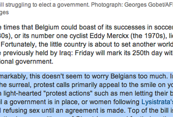 Je me demande si cela va profiter au tourisme, le fait que les médias étrangers parlent de la Belgique comme d’un pays limite hippie où on proteste en se laissant pousser la barbe et on fonctionne sans gouvernement. Les commentaires en-dessous de l’article valent le détour: