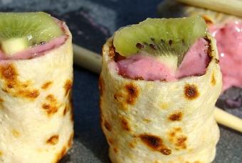 Etaler une bande de crêpe, déposer une couche de riz au lait tout du long et un morceau de kiwi en bas. Rouler.