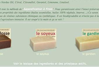 Que se soit dans les pages catégorie ou dans la fiche produit, un carousel permet de visualiser les autres savons de la gamme sans utiliser le « scrolling » ou changer de page. A tout moment l’utilisateur du site peut consulter les pages de ré-assurance (Sous la ligne de flottaison moyenne), avoir un accés rapide à l’ensemble du catalogue ainsi que sur les 5 derniers articles du blog (en bas de page).