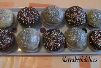 Partagez la pâte en deux, incorporez la moitié du chocolat fondu à l'une des deux moitiés en mélangeant soigneusement. (laisser l'autre moitié pour le glacage) A l'aide de deux cuillères, remplissez au 2/3 les moules à cakes (beurré et fariné) en alternant la pâte nature ensuite la pâte chocolatée au milieu en on recouvre à nouveau de la pâte nature. faites un tourbillon pour faire un marbré. Mettre au four et faites cuire 15 mn à thermostat 6 Une fois cuit attendre qu'ils refroidissent, avant de démoulerGlacer la moitié des cakes avec le chocolat noir restant, et l'autre moitié avec le chocolat blanc fondu parsemer de vermicelles de couleurs et laisser sécher.