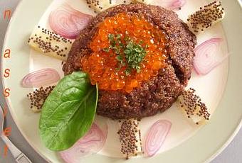 Au moment de servir, émincez l'échalote, le 1/4 de pomme, rincez les jeunes pousses. Dressez dans chaque assiette un dôme du mélange amarante/lentille, nappée d'1 c.s. d'oeufs de truite, disposez les morceaux de pomme et d'échalote autour. N'oubliez pas les jeunes pousses et les graines de pavot ou de moutarde. Assaisonnez d'huile d'olive et de vinaigre balsamique. Servez aussitôt.