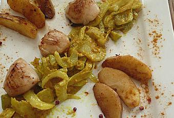 bonsoir,j'ai voulue changer un peu écrire jack plutôt que jacques,oui je sais je ne fait jamais comme les autres,normal je suis unique en mon genre lol et de plus du sucré pour les pommes,salé pour le fenouil saveur anisé et le curcuma,baies roses pour relever toute ma petite cuisine,bon j'ai un pt foiré pour la présentation,rire, il manque des feuilles de fenouil que je n'avais pas,mais le résultat était excellent