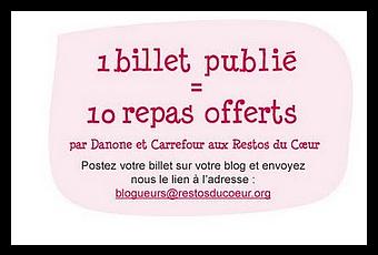 Avec nos blogs, on peut aider les restos du cœur. Concrètement. Comme l’année dernière, Danone et Carrefour se sont associés aux Restos du Cœur pour financer 10 repas pour chaque billet qui parle de la collecte. Il suffit donc de publier sur votre blog un article parlant de la collecte alimentaire qui aura lieu les 4 et 5 mars 2011. C’est simple mais surtout ça permet à des personnes de manger.... En 2010, cette mobilisation des blogueurs avaient permis d’offrir 16 675 repas. Toutes les d'infos ici.