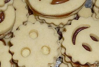 240 g de farine120 g de sucre glace50 g d'amandes en poudre125 g de beurre doux mou1 œufFourrage au choix (pâte à tartiner, sauce caramel, confiture)