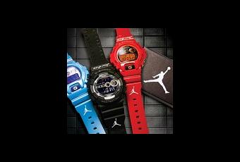 Après la collaboration avec Skull Candy, Jordan Brand remet ça avec Casio G-Shock en produisant trois montres en édition limitée: une DW6900CB-2 Baby Blue en référence aux Carolina Skies, une GD100B-1 Black pour le surnom de MJ « Black Cat » et une DW6900CB Varsity Red pour rendre hommage aux Chicago Bulls.