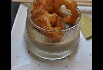 Ingrédients pour 4 personnes : 12 langoustines cuites décortiquées, 100g de rondelles de calamars, 200g de farine à tempura (mélange japonais de farine de riz, farine de tapioca et levure boulangère*), 500g de cèpes surgelés, 3 gousses d'ail, 40cl de bouillon de volaille, 4 cuillères à soupe de crème fraîche, 1/2 citron vert, fleur de sel, poivre, 1l d'huile d'arachide (pour la friture).Coupez les cèpes décongelés en morceaux. Pelez et écrasez les gousses d'ail. Faites revenir les cèpes avec l'ail dans une poêle avec un peu d'huile d'arachide. Laissez-les dorer une petite dizaine de minutes sans cesser de remuer. Salez et poivrez. Mixez les cèpes avec le bouillon de volaille chaud. Rajoutez la crème fraîche. Rectifiez l'assaisonnement en sel et poivre.Vous réchaufferez la crème de cèpes au dernier moment, juste avant de servir (soit à la casserole soit au micro-ondes).Dans un saladier, mélangez la farine à tempura avec 40cl d'eau très froide. La pâte ainsi obtenue doit avoir la consistance d'une pâte à beignets liquide (rectifiez la quantité d'eau si besoin).Dans un wok ou une sauteuse, faites chauffer l'huile d'arachide jusqu'à ce qu'elle soit bouillante (le wok doit être rempli d'huile à mi-hauteur).Trempez successivement les rondelles de calamars et les langoustines dans la pâte à tempura et faites-les frire à peine 1 minute dans l'huile bouillante, jusqu'à ce qu'ils soient bien dorés. Attention aux éclaboussures. Retirez-les et égouttez-les sur du papier absorbant. Salez, poivrez et arrosez de quelques gouttes de citron vert.Réchauffez la crème de cèpes. Répartissez-la dans 4 verres. Déposez par dessus les calamars et les langoustines croustillantes. Servez aussitôt.*Si vous n'avez pas de mélange tout prêt de farine à tempura, vous pouvez mélanger 195g de farine de riz avec 5g de levure boulangère.