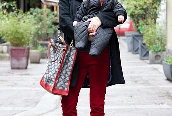 Honte sur moi (et désolé Vanessa !), d'autant plus que le look de Vanessa et de son petit Oscar est super: un petit haut en panthère pour rockiser la tenue et un pantalon en velours rouge qui rappelle la couleur de son sac Celine. Cela me rappelle que j'avais déjà vu un de ces sacs logo retravaillés sur le site de Garance Doré... A défaut de prendre le sac seau, Vanessa a préféré un shopper oversize bien pratique pour mettre toutes les petites affaires de son bébé.