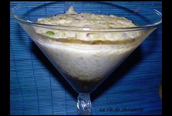 Ingrédients : 60g de riz à grains ronds - 35cl de lait - 25g de sucre semoule - 20g de pistaches vertes - 15g de beurre - 8cl de miel liquide - 1 c à s de crème épaisse - 1 c à s de jus de citron - 1 c à s d'eau de rose ou fleur d'oranger