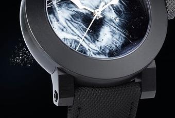Nous le savons, Yvan Arpa est le roi de la provocation. Ses pièces horlogère on les adore ou on les déteste mais ce qui est sûre c’est qu’elle ne nous laissent pas indifférent. Sa dernière pièce met en scène l’ennemi numéro un de l’horlogerie: l’eau. Le liquide coloré se retrouve ici emprisonné dans le cadran dans un boitier acier PVD satiné noir. Il est bon de noter que ce modèle, bien qu’il soit osé, est plus sage que ses prédécesseurs. Peut être permettra-t-il aux septiques d’adhérer à la touche Artya?