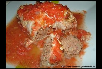Mélanger la viande hachée avec l’ensemble des ingrédients (sauf la tomate pelée et gruyere) et farcir les feuilles de chou. Placer chaque feuille de chou farci dans un plat