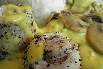 * Ajouter le Noilly Prat et laisser évaporer un peu avant d'y ajouter le fumet de poisson. Laisser bouillir quelques secondes et verser la crème fraiche et la pincée de curcuma. Laisser réduire un peu et ajouter (hors du feu) la maïzena préalablement diluée dans un peu d'eau. Mélanger et remettre sur le feu jusqu'à épaississement souhaité. Rectifier l'assaisonnement si nécessaire.