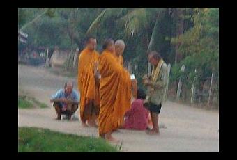 Il est 6h00 du mat' j'ai des frissons,enfin n'exagérons pas il fait 24 degrés ce matin et déjà 50% d'humidité mais par rapport à cet après-midi c'est bien, car l'hiver,ici,est fini,à 14h00 il fera 35 degrés avec presque 70% d'humidité,les orages vont débuter vers la fin du mois et puis il fera de plus en plus chaud jusqu'au mois de mai(cela peut aller au delà de 40 degrés) peut alors commencer la mousson avec 99% d'humidité mais des températures plus raisonnable,mais mais ,on n'est pas là pour la météo,les moines viennent de passer et le "TAMBOUN"(c'est mieux pour la prononciation)s'est fait!!